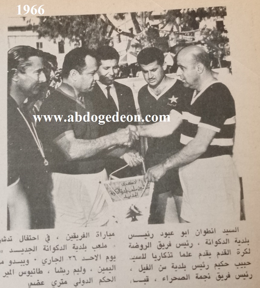 نادي الروضة الرياضي - الدكوانة : تأسس سنة 1941 المؤسسون : جوزف توفيق عنيد - يوسف حنا بو عبود - جورج قيصر ابي حبيب - اميل قيصر ابي حبيب - ادمون يوسف وازن - توفيق قيصر ابي حبيب - جان نعيم الخوري - يوسف رزق الله زعيتر. رؤساء النادي المتعاقبون : جوزف توفيق عنيد - ملحم جرجس الصيفي - جوزف حنا ضاهر الناكوزي - انطوان ابراهيم ملحم بو عبود - روبير عبود ابي عبود - جورج عبدو خير ابو عبود - انطوان جورج قيصر ابي حبيب - عبدو مارون ابو عبود - عبدو سامي خوري - جورج توفيق زيدان - خليل بطرس بو عبود - جورج انطون بطرس بو عبود. |