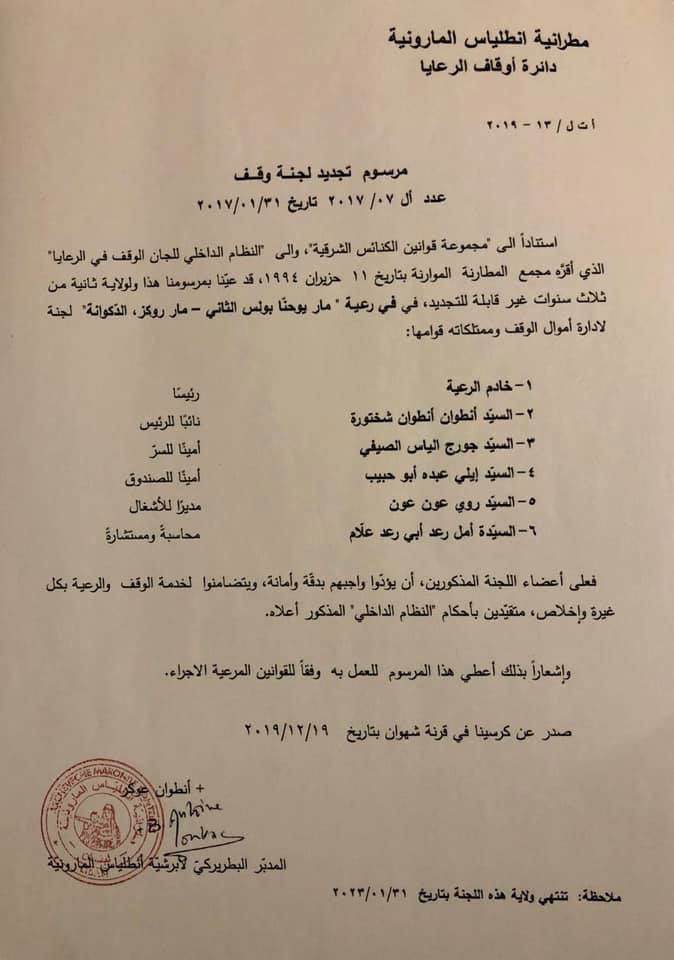 1991. المسؤول عنها حالياً الطالب جورج سعيد. في الرعيّة حالياً ثلاثة أوقاف: يضم كاهن الرعيّة والسادة انطوان بطرس بو