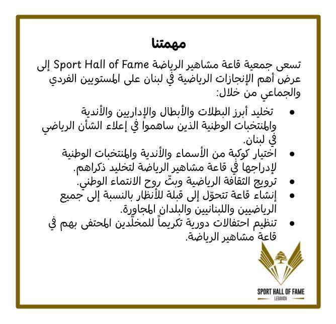 أجنحة ذهبية تحتضن الأرزة 24-10-2025 وأوضح نائب رئيس اللجنة التأسيسية الإعلامي غياث ديبرا أن الأجنحة في الشعار ترمز إلى طموح الفوز وعزم التوثّب لتحقيقه، واللون الذهبي إلى النجاح والتميّز في المنافسات الرياضية. وتحتضن أجنحة التفوّق الأرزة رمز ديمومة لبنان وسرمديته، والتي يستلهم البطلات والأبطال منها الشموخ الدائم. وتضم اللجنة التأسيسية للجمعية، التي حصلت على العلم والخبر في اواخر تموز الماضي، كلاً من: رائد جرجس رئيساً (ممثل الجمعية تجاه الحكومة)، غياث ديبرا نائباً للرئيس، وديع عبد النور أميناً للسر، علي خليفة أميناً للصندوق، ابراهيم الدسوقي محاسباً، سعيد غبريس مستشاراً وجلال بعينو مسؤولاً إعلامياً. وستُعنى "قاعة مشاهير الرياضة"، الأولى من نوعها في المنطقة والشرق الأوسط، بالحفاظ على الذاكرة الرياضية وعرض أهم الإنجازات الرياضية في لبنان على المستويين الفردي والجماعي، وتكريم أبرز البطلات والأبطال والإداريين والأندية والمنتخبات الذين ساهموا في إعلاء الشأن الرياضي في لبنان. كما ستعمل الجمعية على ترويج الثقافة الرياضية وبثّ روح الإنتماء الوطني من خلال إبراز تاريخ المنتخبات الوطنية والأندية الفائزة بالألقاب المحلية والعربية والدولية في الألعاب كافة، والتي ساهمت بفضل إنجازاتها أو نشاطها بجمع المناصرين على مختلف انتماءاتهم في لبنان وبلدان الانتشار. وفي إطار الخطوات