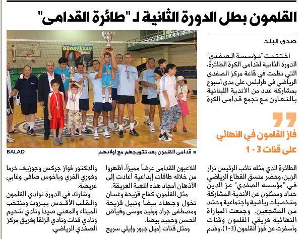 نتائج بطولة القدامى 16/6/2008 قدامى القلمون - قدامى القلب الاقدس 3/0 17/6/2008 قدامى قنات - قدامى شحيم 3/1 مركز الصفدي - قدامى الزلقا 3/1 19/6/2008 مركز الصفدي - قنات 0/3 القلمون - المينا طرابلس 3/0 21/6/2008 نهائي الدورة الساعة 7 مساء قدامى القلمون - قدامى قنات 3/1 وفاز بالبطولة