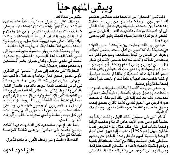 وتلاه اللواء الركن خوري "عن نحاس الكبير ورفيق الدرب، والذي سينال التكريم ايضاً من المؤسسات الأهلية الرياضية في موعد نحدده قريباً"، ثم تكلم كل من الزميلين غازي الميقاتي ونعيم نعمان عن "الوفاء والدروس لنا جميعاً من تجربتك".