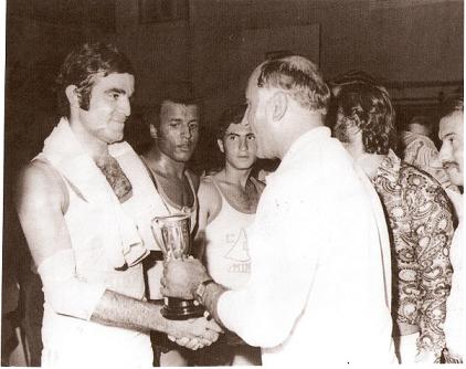 مدير عام الشباب والرياضة اللبناني العقيد غالب فحص يسلم الكأس الى جان عزيز