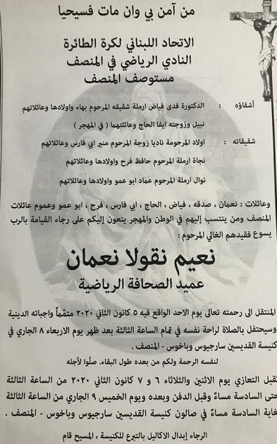 الراحل نعيم نعمان في ذمة الله 06-01-2020 رئيس واعضاء تجمع قدامى الكرة الطائرة في لبنان ينعي فقيد الرياضة اللبنانية , الامين العام المؤسس للاتحاد اللبناني للكرة الطائرة , الرئيس المؤسس للتجمع ورئيسه الفخري الراحل نعيم نقولا نعمان الذي كان له باع طويل في الادارة الرياضية وبخاصة الكرة الطائرة نودعه متقدمين بالعزاء من أسرته والعائلة الرياضية وكل من عرفه".
