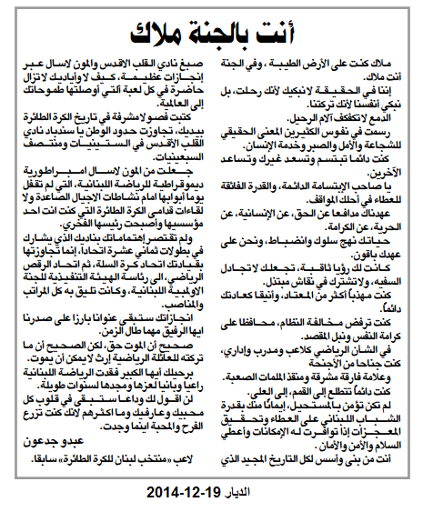 قداس وجناز ذكرى مرور عام على وفاة ضمير الرياضة اللبنانية الراحل أنطوان شارتييه 07-12-2015 |