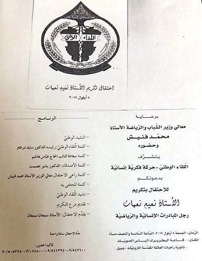 ينظم اللقاء الوطني إحتفالاً تكريمياً للأستاذ نعيم نعمان الجمعة. |